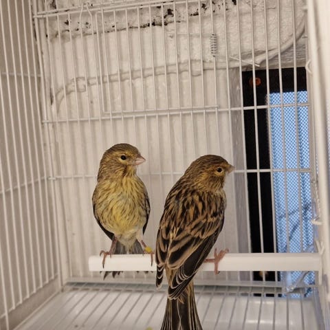 2 stk 4 uker gamle. Søsken. Ukjent kjønn. Ønsker å bytte I andre kanarifugler i andre farger