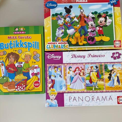 Fire stk pent brukte spill selges samlet. Spillene er beregnet på barn fra 3 og 4 år.