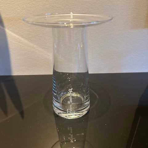 Finn Schjøll vase i oransje glass. Vasen har rund fot og bred topp med hull. Passer som borddekorasjon eller til bruk i vinduskarm og andre flater innendørs.