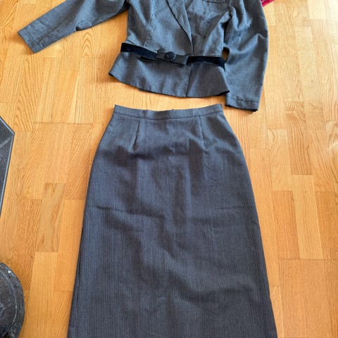 L’evolution drakt med skjørt og jakke i størrelse L, bestående av jakke med knapper foran og matchende langt skjørt med utsvinget fasong nederst. Materiale: 68 % viskose og 32 % polyamid, med glatt fôr på innsiden. Fôret i skjørtet har røket i sømmen, og må fikses. Man kan eventuelt enkelt fjerne hele fôret, og bruke et løst underskjørt i stedet. Jakken har ingen skader. Lengden på skjørtet er ca 99 cm, lengden på jakken er ca 75,5 cm. Det er vanskelig å få frem riktig farge. Jeg har skrevet på bildene hvilken farge som er mest riktig. Stoffet er litt melert, noe som gjør at det skifter litt farge etter lyset.