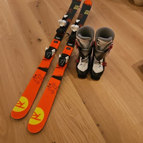 Rossignol alpinski med tilhørende alpinstøvler. Skiene har integrerte bindinger fra Rossignol. Støvlene er fire-spenners alpinstøvler i sølvfarge med røde detaljer og justerbare spenner. Sett egner seg til vanlig alpinkjøring i bakke. Nøyaktig lengde på ski og størrelse på støvler er ikke oppgitt og bør måles eller prøves ved interesse.