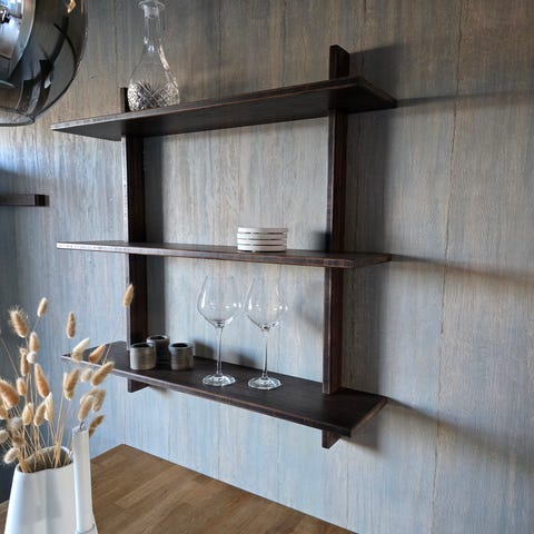 Selger håndlagde vegghyller i heltre, behandlet med mørk brun beis for et varmt og eksklusivt uttrykk.