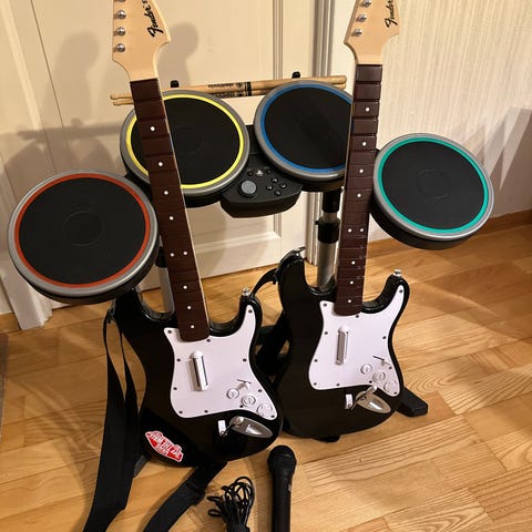 Rock Band instrumentpakke med gitar, trommesett og mikrofon til spillkonsoll. Har ikke fått testet ettersom jeg ikke har ps3 lenger, men veldig lite brukt og minimalt med merker.