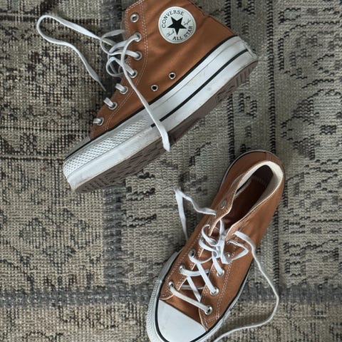 Converse Chuck Taylor All Star høye sneakers i brun tekstil, størrelse 43. Klassisk modell med gummisåle, snøring foran og Converse All Star-logo på siden. Overdel i canvas med metallhemper for lissene og polstret innersåle med Converse-merking. Passer som hverdagssko og fritidssko. De er flat