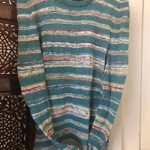 Choise by Danywear genser for dame i størrelse M. Genseren er flerfarget med mønster i hovedsakelig grønne, svarte og blå toner. Rund hals med ribbestrikket kant.