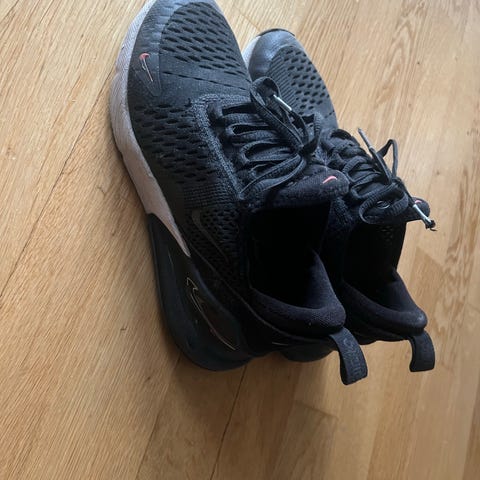 Nike Air Max 270 joggesko i svart farge i størrelse 40. Skoene har overdel i tekstil med syntetiske detaljer og snøring foran. Modellen har synlig Air Max-demping i hælen og gummisåle. Egnet som fritids- og hverdagssko.