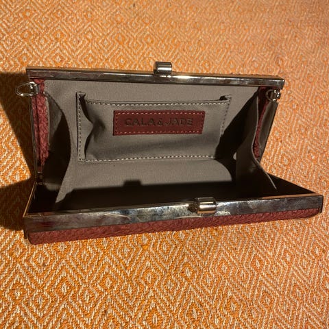 Cala Jade clutch veske for dame i svart kunstskinn. Vesken har strukturert overflate og metallramme med klipslås på toppen. Innvendig er den fôret og har en liten lomme til oppbevaring av mindre gjenstander. Passer til å bære nødvendigheter som mobil, nøkler og små personlige eiendeler ved ulike anledninger.