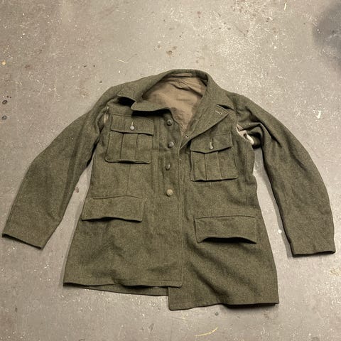 Tilstand: Jakken har betydelig bruksslitasje og noe små hull(se bilder).Det kan se ut som soldaten har sydd ull forsterkninger under albuene for å unngå hekseskud(?).