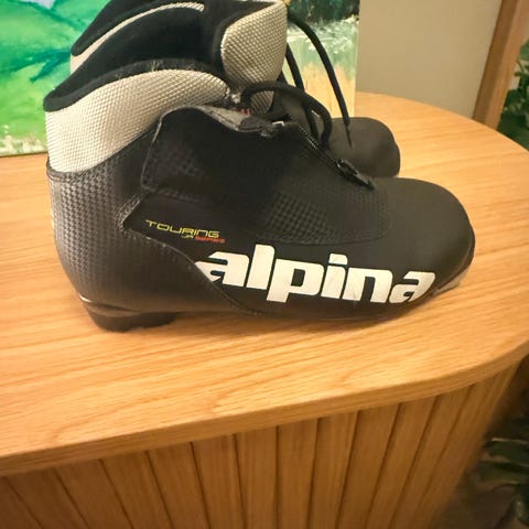 Alpina Touring langrennsstøvler i svart. Støvlene har snøring med glidelås og beskyttende klaff over vristen. Overdelen er i syntetisk materiale med polstret ankelparti og lys kontrastfarge øverst. Sålen har klassisk turbindingsfeste og grovt mønster for bedre feste ved gange uten ski. Egnet til klassisk langrenn og turbruk.