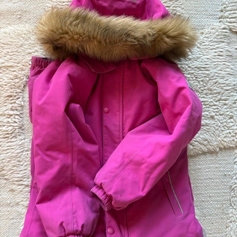 Reima vinterdress for jente i størrelse 134. Dressen er rosa med mørke kontrastfelt og refleksdetaljer på ermer og ben. Ytterstoff, fôr og vattering er i polyester. Glidelås foran og strikk nederst på bena for bedre passform. Egnet som yttertøy i kaldere vær for barn rundt 9 år, til bruk i barnehage, skole eller uteaktiviteter. Strikken under sko er røket på begge sider. Det er noe slitasje i stoffet (se bilder).
