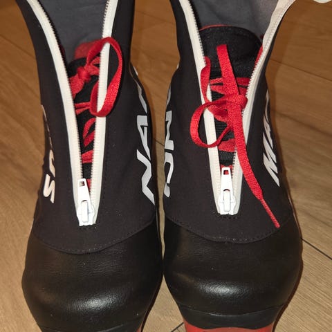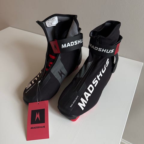 Madshus langrennsko i størrelse 41. Skoene er svarte med blå detaljer og har snøring med beskyttende glidelåslukking over vristen. Yttersålen er tilpasset klassisk langrennsski med kompatibelt bindingssystem (se bilder for detaljert såletype). Overdelen er laget i syntetisk materiale med forsterkninger i front og hæl for bedre slitestyrke. Egnet til bruk på langrennsturer i preparerte løyper.