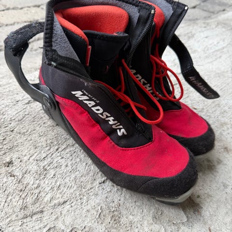 Madshus langrennsko i størrelse 38 og 41. Skoene er svarte med blå detaljer og har snøring med beskyttende glidelåslukking over vristen. Yttersålen er tilpasset klassisk langrennsski med kompatibelt bindingssystem (se bilder for detaljert såletype). Overdelen er laget i syntetisk materiale med forsterkninger i front og hæl for bedre slitestyrke. Egnet til bruk på langrennsturer i preparerte løyper.