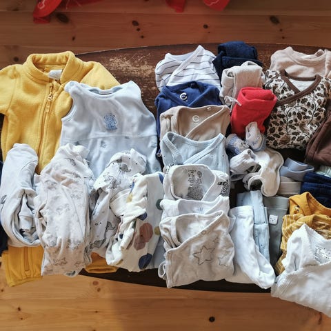 Fin pakke med bodyer, bukser, strømpebukser, seleshortser og luer/votter/tøfler fra Newbie. Et par av de hvite plaggene har noe misfarging rundt halsen, ingen hull eller andre skader. Mest i str 56, litt i 50😊