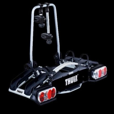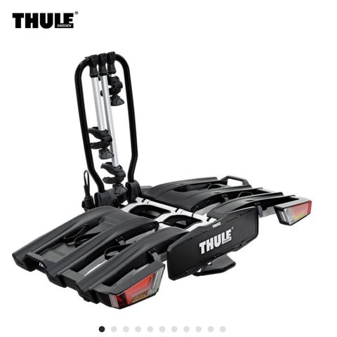 Tesla sykkelstativ bakmontert til hengerfeste. Sykkelstativet er beregnet for montering på hengerfeste og er vist brukt på Tesla Model S, 3, X og Y. Det har justerbar aluminiumsramme og polstrede holdere som gir feste for syklene. Stativet er konstruert for transport av opptil to sykler, med maksimal lastevekt på opptil 54 kg.
