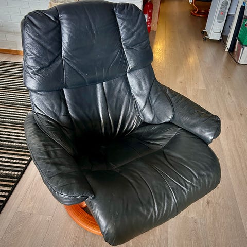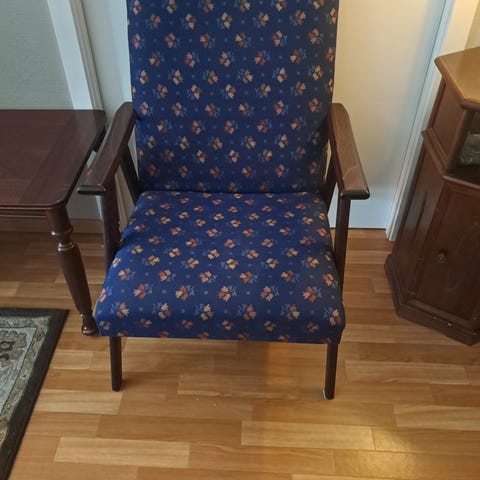 Selger denne stolen med høy rygg pga plassmangel. Det er med krakk. God å sitte i og pen i stoffet.Pris 200 kr