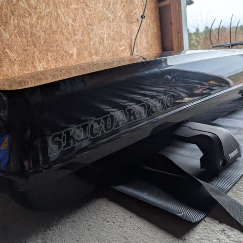 Skiguard 830T takboks me Thule Wingbar takbøyler. Takboksen er lang og lav, egnet for transport av ski og annet bagasje på biltak. Innvendig er det festesystem med stropper og holdere for å sikre innholdet under kjøring. Boksen er av nyere dato - fin stand. Noen bruksmerker. Plass til 5+ par ski og lengde opptil 205 cm