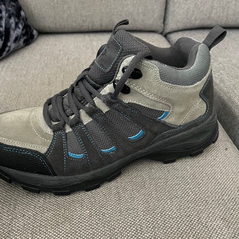 Tursko med høy ankelstøtte i størrelse 38. Skoene har snøring foran og mønstret yttersåle som gir godt grep på variert underlag. Overdelen er i blå og grå tekstil med syntetiske forsterkninger. Modellen passer til tur og fritidsbruk i ulike værforhold. Innvendig fôr gir økt komfort rundt fot og ankel.