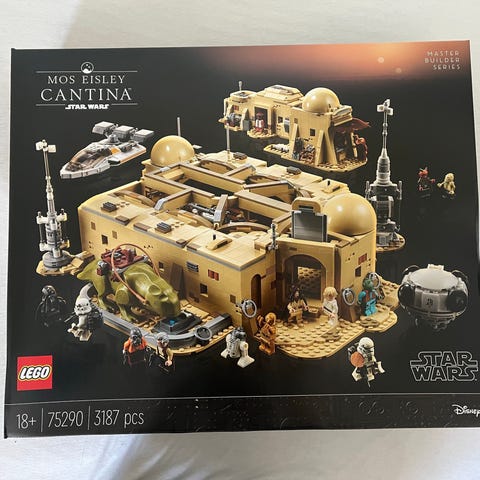 LEGO Star Wars UCS Mos Eisley Cantina 75290. Settet viser den kjente kantinen fra Star Wars-universet med bygning, interiør og ulike detaljer fra scenen. Inneholder flere minifigurer, kjøretøy og tilbehør som kan brukes til å gjenskape eller lage egne Star Wars-scener. Passer for bygging, utstilling og lek for Star Wars-interesserte.