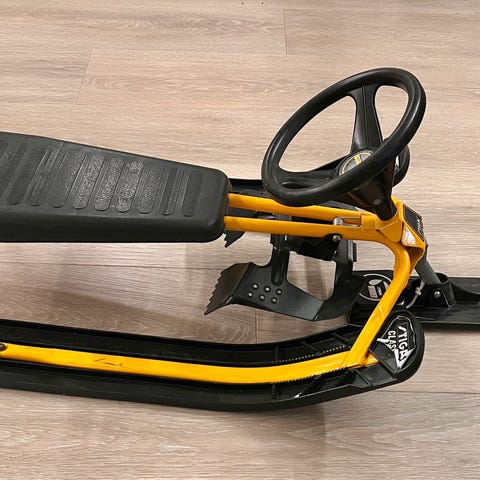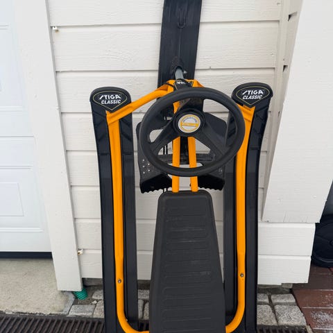 Stiga Snowracer rattkjelke i svart og gul farge. Kjelken har tre meier, rattstyring og fotbrems. Leveres med drareim foran for enkel trekking. Egnet for barn som vil ake i bakker på snøføre. Laget i robust plast og metall for vinterbruk.