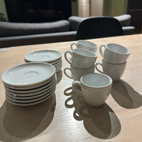 8 sett Con Gusto espressokopp med skål. En skål med et hakk, se bilder. Alle de andre delene uten feil, som nye.
