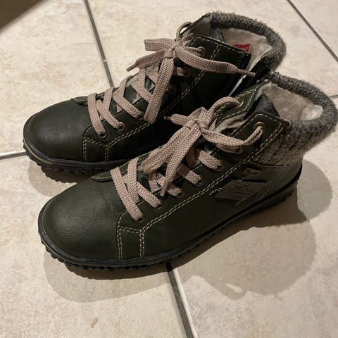 Rieker vinterstøvler i størrelse 37. Støvlene er i svart materiale med grov såle og lav hæl. De har glidelås på siden for enkel av- og påtaking, samt elastisk felt i skaftet for bedre passform. Innsiden ser ut til å være fôret for økt komfort i kaldere vær. Passer til hverdagsbruk i vinterhalvåret.