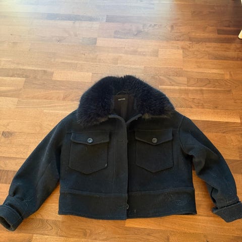 MEOTINE jakke for dame i størrelse M. Jakken er svart og laget i ullmateriale. Den har kort, rett passform med krage og knappelukking foran. To brystlommer med klaff og knapper. Egner seg godt som ytterjakke i overgangssesonger og kjølige dager.