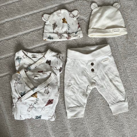 Hust & Claire sett med omslagsbody og bukse til baby i størrelse 62. Bodyen er i ull og bambusviskose og er dermed ekstra myk mot huden. Buksen er ull. Ingen anmerkninger på noen av plaggene - hele og fine ☺️
