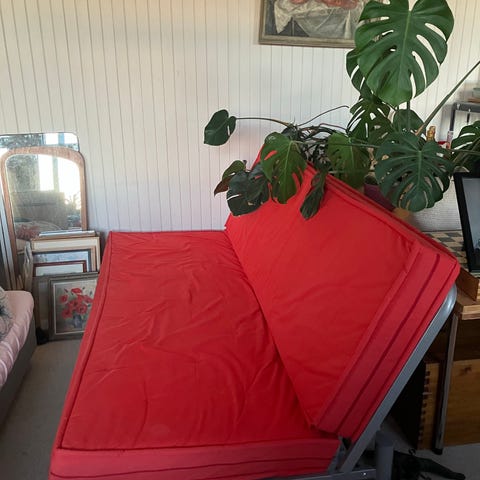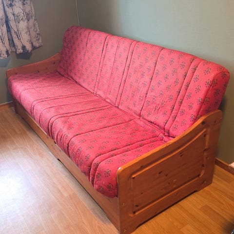Sovesofa. Trekk kan taes av og vaskes. Skumgummi. Fra røykfritt og dyrefritt hjem. Mål oppgies ved interesse. Må hentes innen onsdag 18. februar.