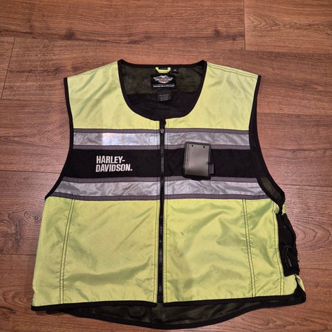 Harley-Davidson refleksvest i oransje med brede refleksstriper foran og bak. Vesten har glidelåslukking i front og justering i sidene. Stor Harley-Davidson-logo på ryggen og mindre logo på brystet. Meshfôr på innsiden for bedre ventilasjon. Egnet som synlighetsvest ved motorsykkelkjøring eller annen trafikkbruk.