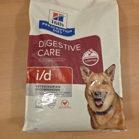 Sekken veier i utgangspunktet 10kg, men vi har forsøkt foret til hunden vår og hun var rett og slett for liten for bitene så det er igjen 8,5kg.