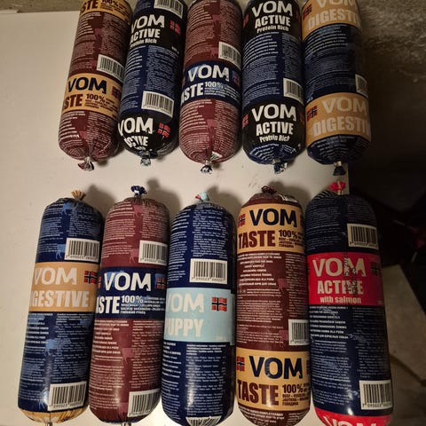 VOM Puppy hundemat i pølseform, 12 kg. Fôr til valp, egnet som fullfôr eller tilskudd til annet hundefôr. Frossen. Selger begge samlet for 250,- Må hentes i larvik