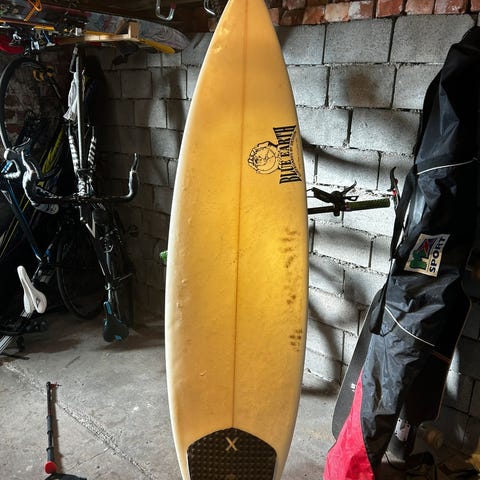 Surfebrettet har fått seg et par trøkker, og ding-fiksene er ikke de peneste, men de er tette. Heller ikke heldig farge på den voksen som er på brettet. Brettet er på 31 liter og funker fjell.