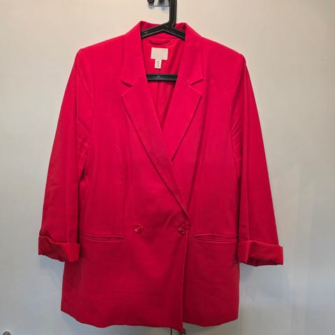 H&M blazer for dame i størrelse M. Jakken er svart og laget i polyester. Klassisk modell med krage og jakkeslag, én knapp i front og lommer. Ermene er vist oppbrettet på bildene, men kan brukes både med oppbrett og i full lengde. Fôret innside for bedre passform og komfort. Egnet til bruk over skjorte, topp eller kjole i hverdagen eller til mer formelle anledninger. Oversized.