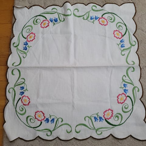 Fin løper I knøttsmå korssting Pent sydd pent på vrangen også sees på.et av bildene som lagt ut tynt fint stoff Bredde 31cm lengde 65 cm