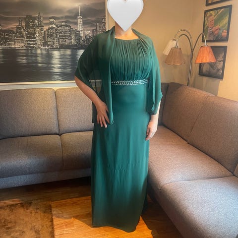 Kjolen er brukt èn gang og har siden hengt i skapet. Jeg brukte den som høygravid, så den har god plass til mage selv om den ikke er en gravidkjole. Det følger med en veske, hårpynt og sjal.