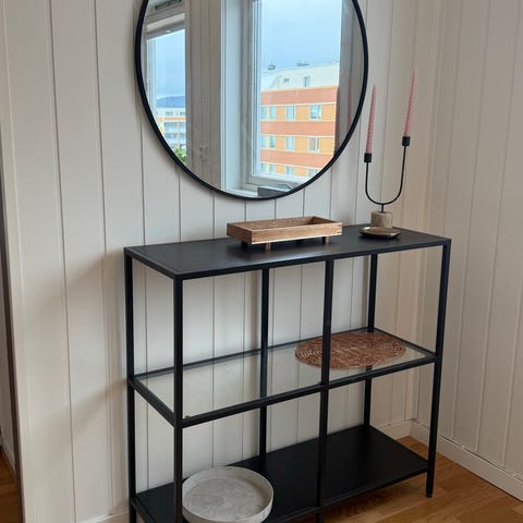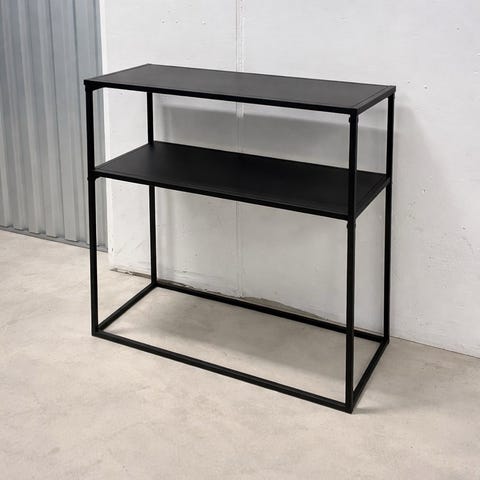 Svart hylle i metall med åpen ramme. Hyllen har to hyllenivåer nederst og en toppflate som kan brukes til oppbevaring eller utstilling. Passer til stue, gang, soverom eller kontor for oppbevaring av bøker, dekor eller annet utstyr.