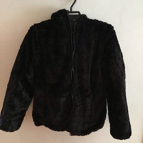 Med hette, trykk-knapper og lommer. Den øverste knappen er litt løs, så trenger bare å sys strammere. Er nok litt stor i størrelsen, passer gjerne S-M
