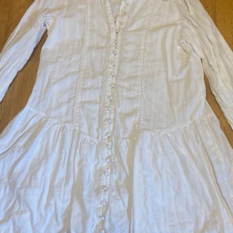 YAS Maxi hverdagskjole for dame i størrelse M. Kjolen er laget i viskose og har flerfarget stripemønster i mørk burgunder og hvitt. Modellen er en skjortekjole med krage, knappestolpe i front og ermer som rekker omtrent til under albuen. Lengden går ned mot leggene. Stoffet er lett og faller mykt. Passer som hverdagskjole eller til enkle anledninger.