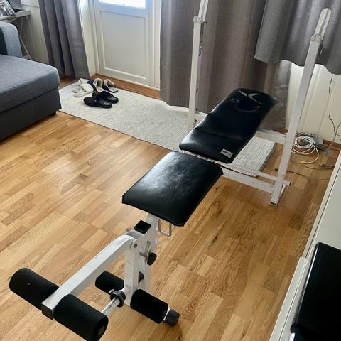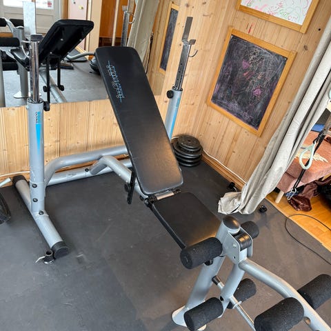 Treningsbenk med 3 stenger og vektskiver selges samlet. 2 rette og 1 z-stang, Ø25. Ca. 120 kg vektskiver Ø25mm i forskjellig størrelse medfølger. Knestrekk og knebøy inkludert.