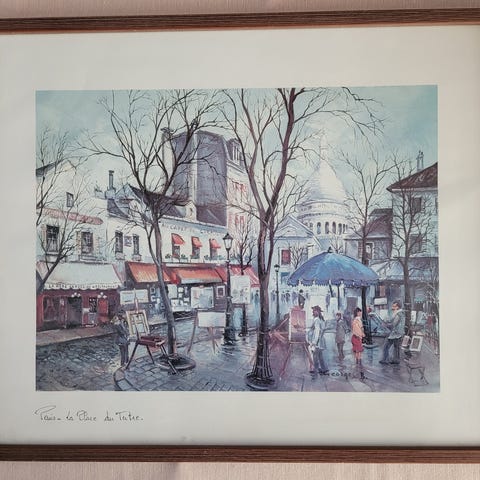 Kunstner Diaz, gatebilde med ramme. Motivet viser en smal gate med trapper, bygårder, butikker og mennesker i et bymiljø. Bildet er utført i farger og innrammet med enkel treramme. Passer som veggdekor i stue, gang eller andre oppholdsrom.