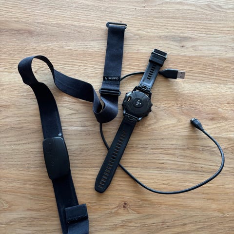 Garmin pulsklokke med svart silikonreim og optisk pulssensor på baksiden. Klokken leveres sammen med et separat Garmin pulsbånd med gul sensor og USB-ladekabel. Egnet til trening og aktivitetsmåling, med mulighet for pulsmåling via både klokkens innebygde sensor og det medfølgende pulsbåndet.