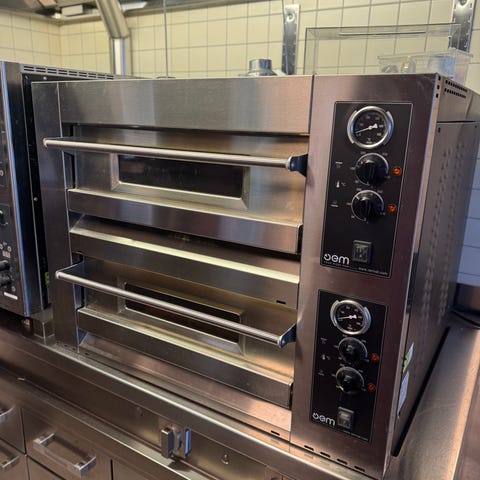 Profesjonell elektrisk pizzaovn med to separate stekekamre. Hvert kammer har eget betjeningspanel slik at varmen kan justeres individuelt.