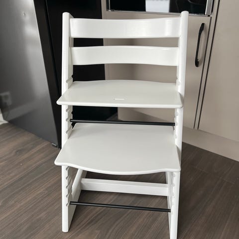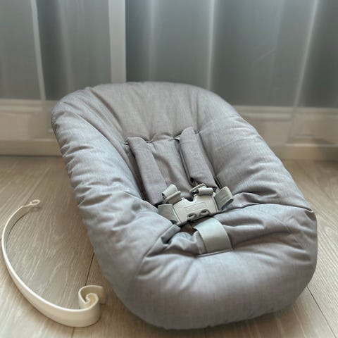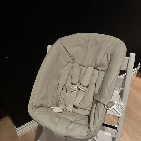 Stokke new born seat som kan festes på Stokke tripptrappstol. Setet kan justeres slik at babyen både kan ligge og sitte, så det passer bra til både mating og avslapping.