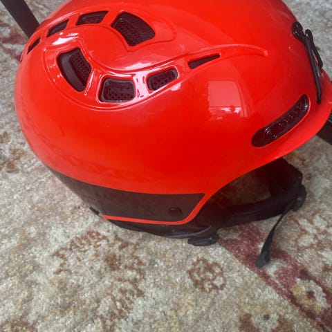 Salomon skihjelm med integrert visir i størrelse M. Hjelmen er oransje med justeringshjul bak for tilpasning av passform. Den har ventilasjonsåpninger på toppen og sider, samt nedfellbart visir i mørk tonet plast som fungerer som skibrille. Pent brukt men noen små bruksmerker.