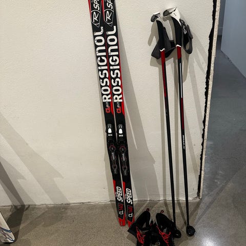 Pent brukte ski og støvler, skoene er i str. 37 og stavene er 115cm