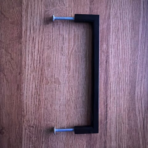 Rett, avlangt design med to festepunkter. Egnet som håndtak til skap, skuffer eller dører på kjøkken, bad eller andre møbler. Fargen er matt eller halvmatt svart, og materialet fremstår som metall for solid og stabil bruk.