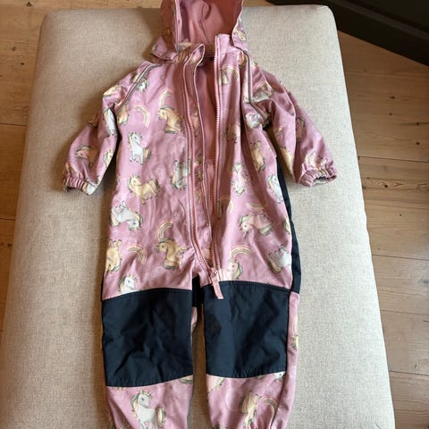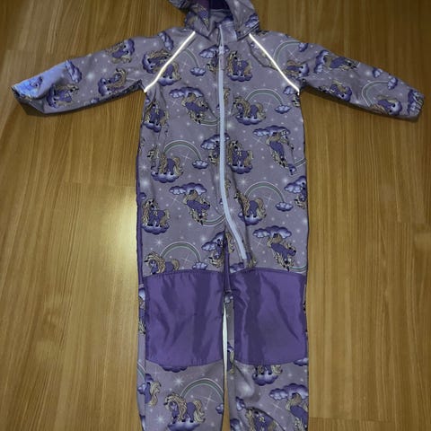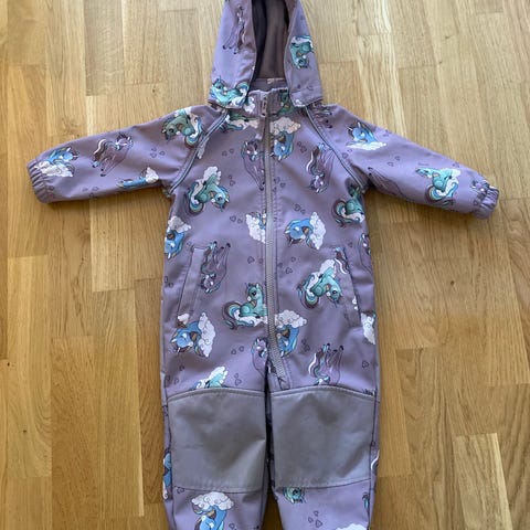 Name it fleeceheldress for jente i størrelse 92. Heldressen er i lilla fleece med mykt innvendig fôr og glidelås foran. Plagget har lange ermer og ben, samt hette. Yttersiden har et mønster med hester, skyer og stjerner i ulike lillatoner. Egnet som mellomlag eller kosedress til hverdagsbruk.