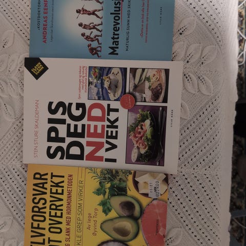 Pakke med tre kokebøker om sunn mat og kosthold. Bøkene omhandler blant annet grønnsaksbasert matlaging, oppskrifter uten brød og generelle prinsipper for et sunnere kosthold. Egner seg for personer som ønsker inspirasjon til brødfri kost, lavkarbo eller mer grønnsaksfokusert matlagning.