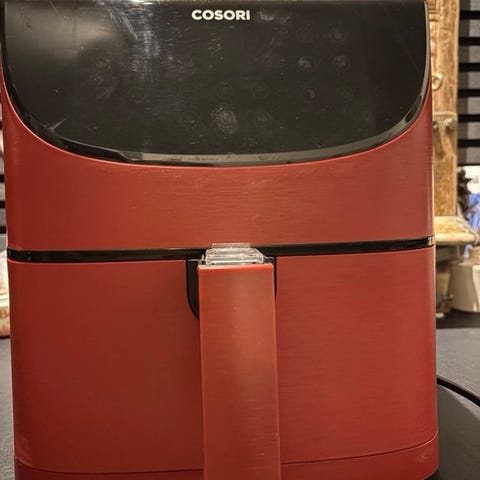 Cosori Premium II Plus airfryer med kapasitet på 6,2 liter. Modellen har digitalt kontrollpanel på fronten med flere forhåndsinnstilte programmer for ulike typer mat. Enheten har vindu i kurven for innsyn under tilberedning og justerbar temperatur og tid.
