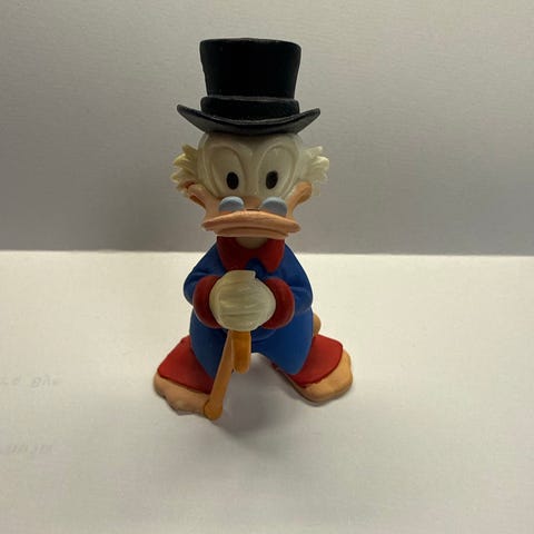 Disney Onkel Skrue figur i flerfarget utførelse. Figuren forestiller Onkel Skrue med flosshatt, briller, stokk og dokumentmappe med penger. Passer som samleobjekt eller dekorasjon. Materiale ser ut til å være malt hardplast eller lignende. Detaljert utforming med tydelige farger og klassisk tegneseriestil.